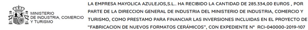 Import rebut: 11.043,48 €La empresa MAYOLICA AZULEJOS S.L. ha recibido la cantidad de 20.000 euros para su solicitud de ayudas dentro de la CONVOCATORIA DE AYUDAS DE CERTIFICACION INTERNACIONAL-2023 de la CAMARA DE COMERCIO DE ESPAÑA con expediente nº BDNS:701616 «financiado por la Unión Europea - NextGenerationEU»